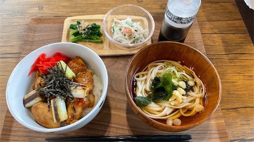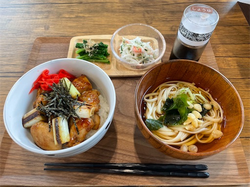 本日のメニューは焼き鳥丼、ミニうどん、青菜のお浸し、大根サラダです。
