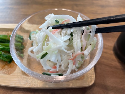 大根サラダはパリパリの大根サラダじゃなく、しんなりした大根サラダです。実家の大根サラダと同じで好きな大根サラダでした。