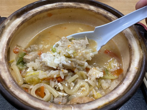 普通はうどんを食べ終わって、その残り汁にごはんを入れて雑炊にするものですが、ここのお店はうどんと雑炊のハーフ&ハーフでした。