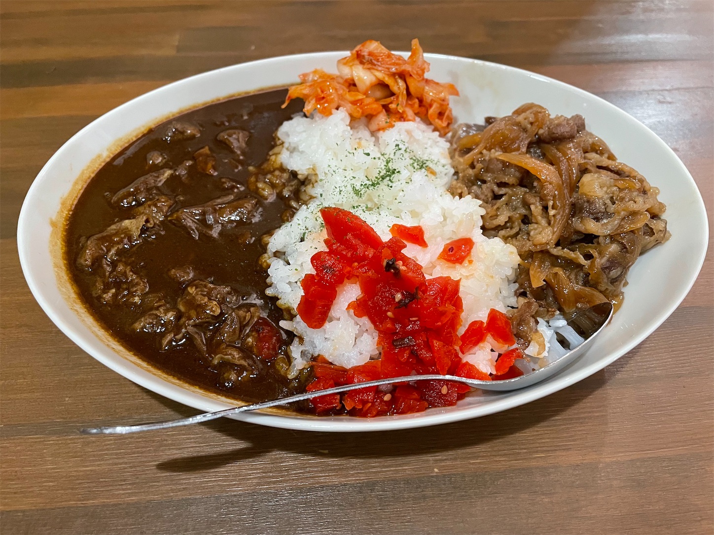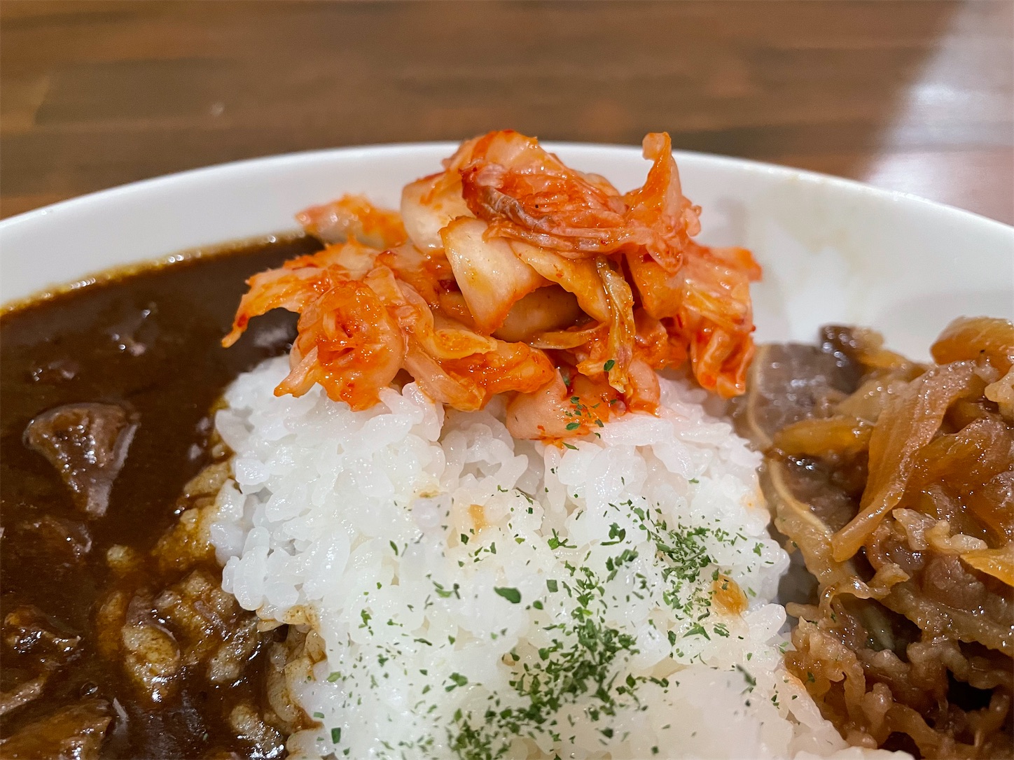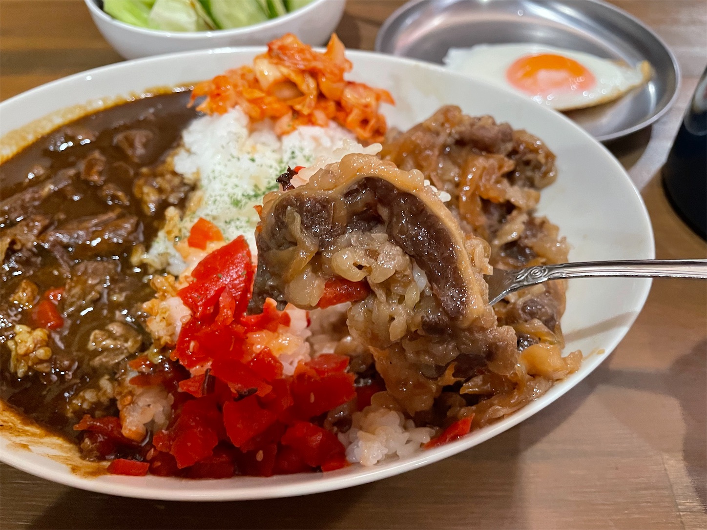 自分の勘違いで牛すじカレーと牛バラカレーの合い盛りと思っていたら、牛すじカレーと牛バラ焼きの合い盛りでした。
