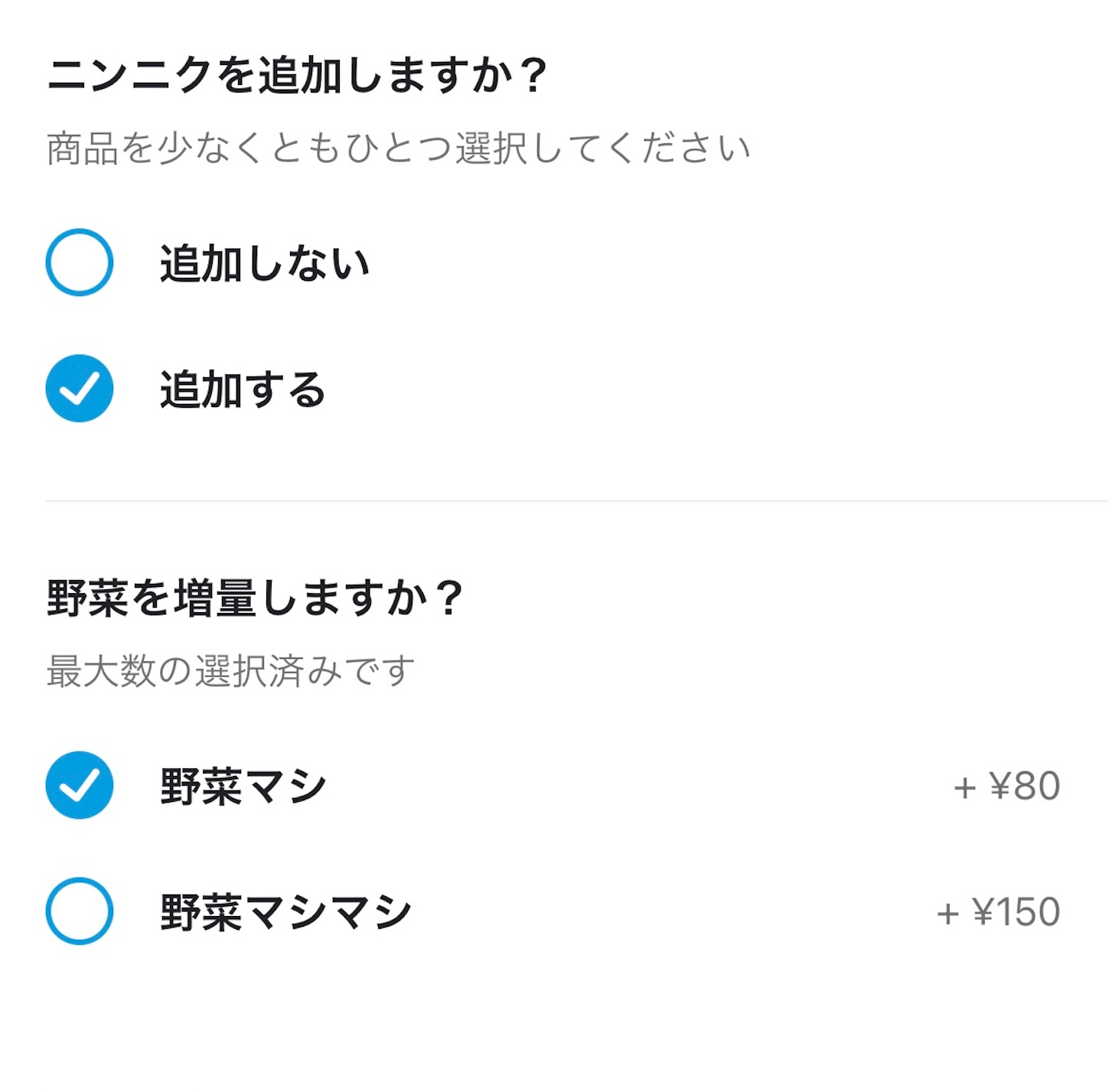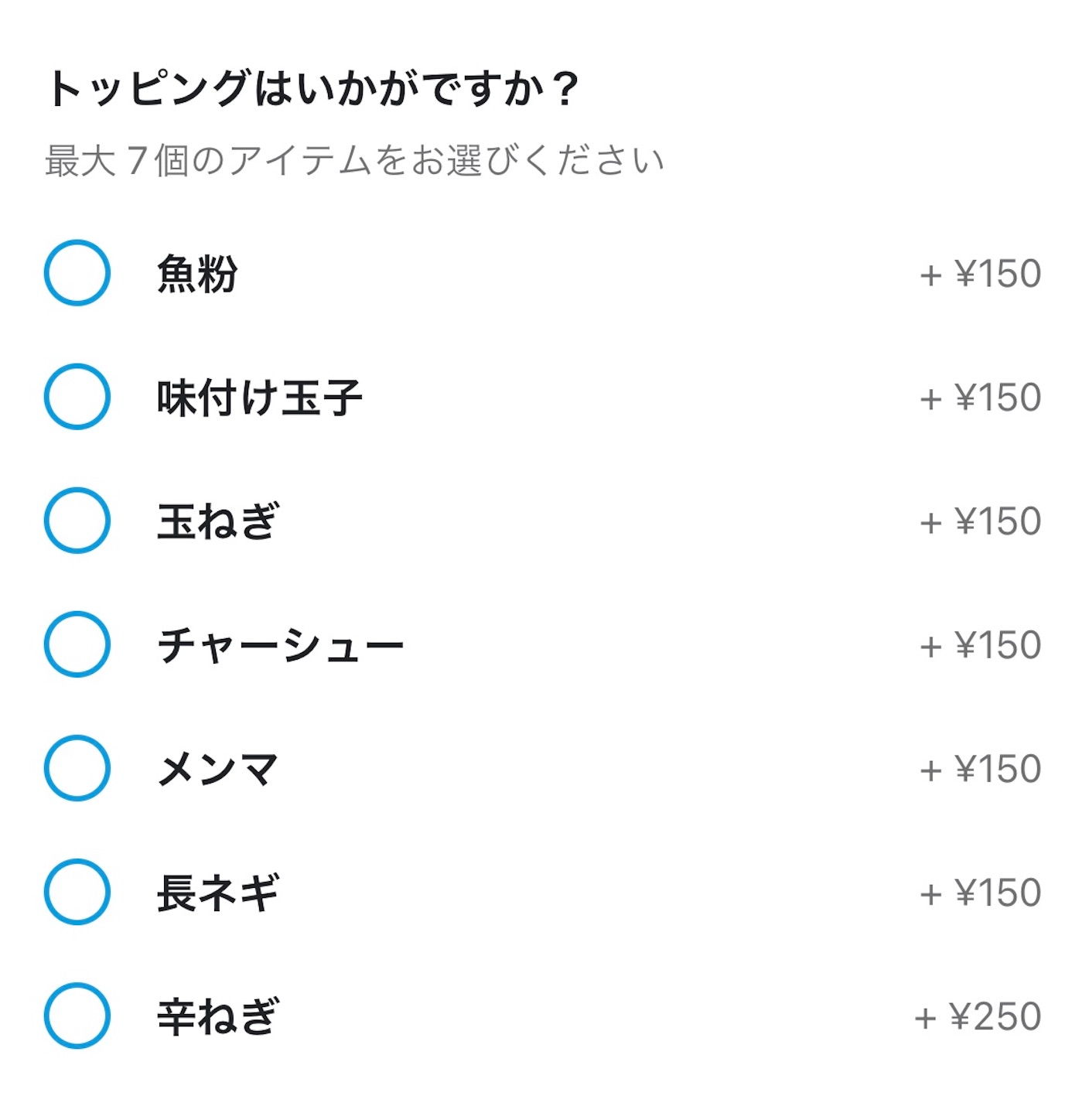 食べたいラーメンを選んで、トッピングや増しなどをチェックするだけ!