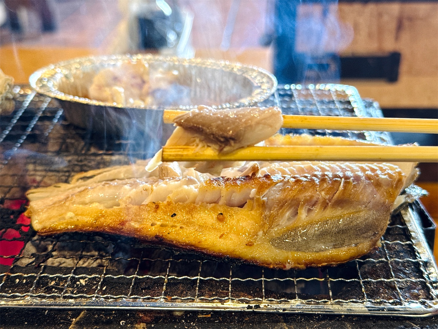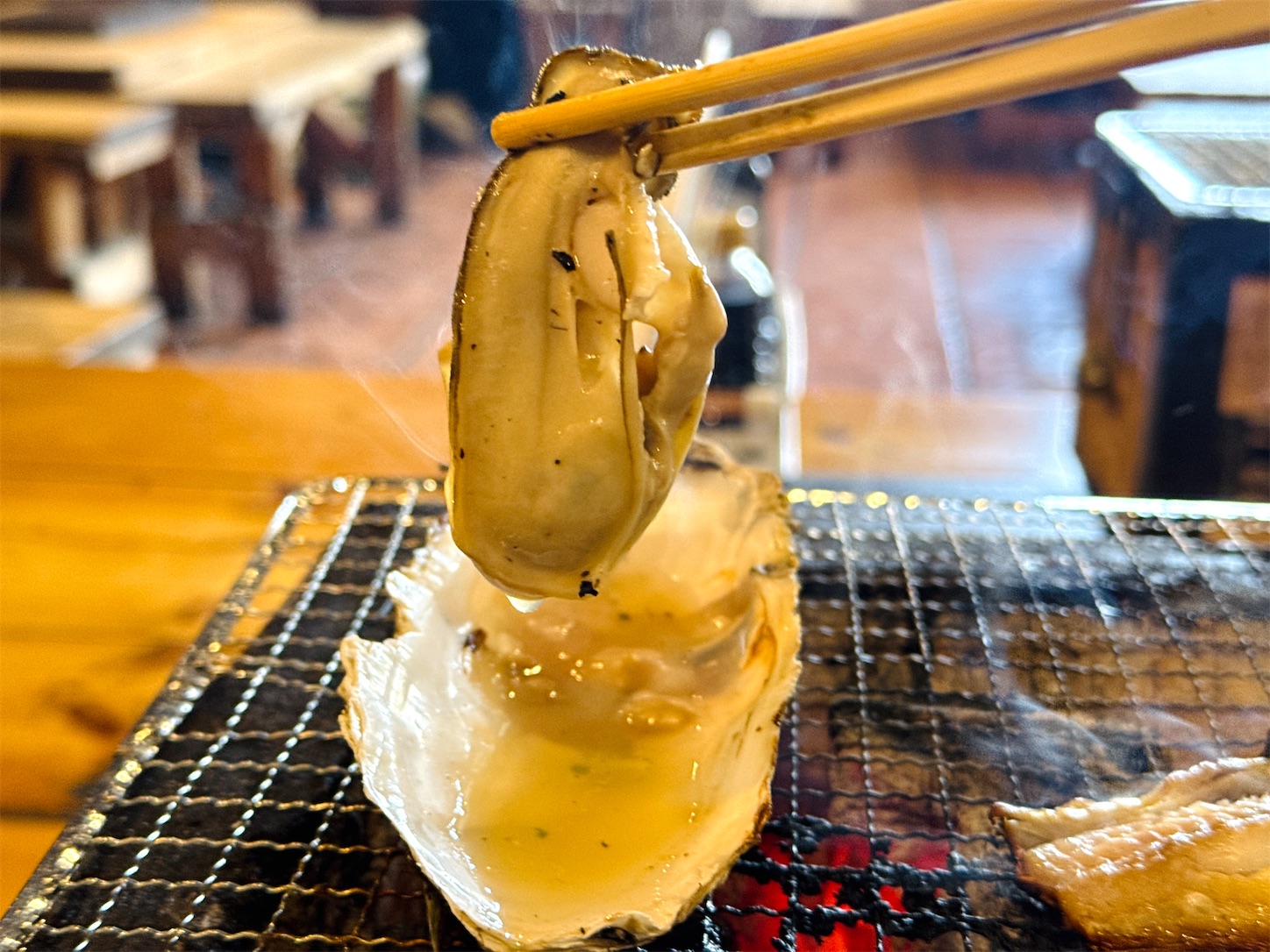 牡蠣は熱が入ってぷっくりとしてきました。中までアツアツなので火傷に気をつけて下さい。